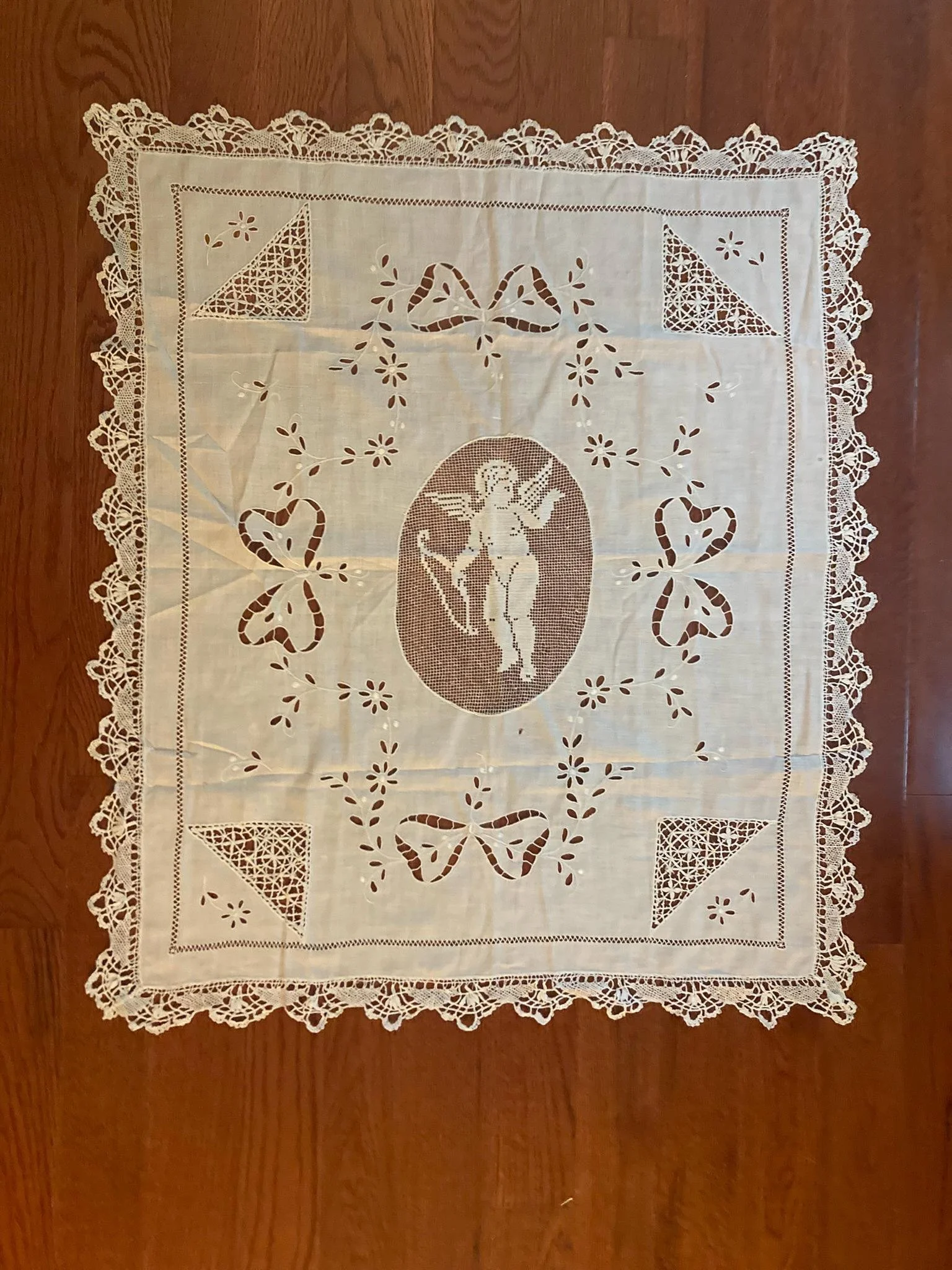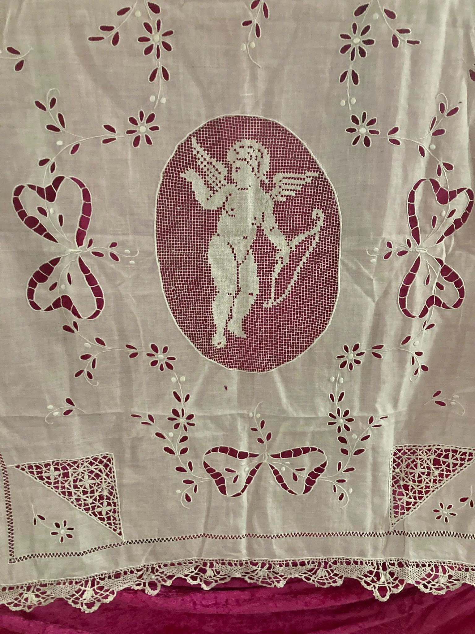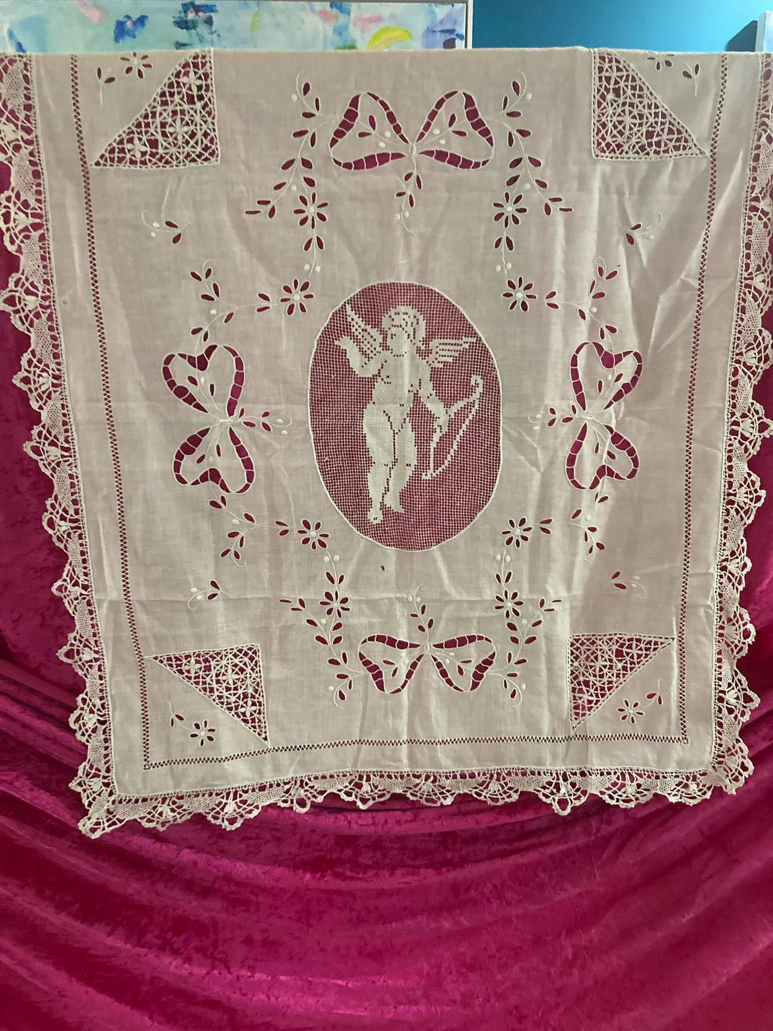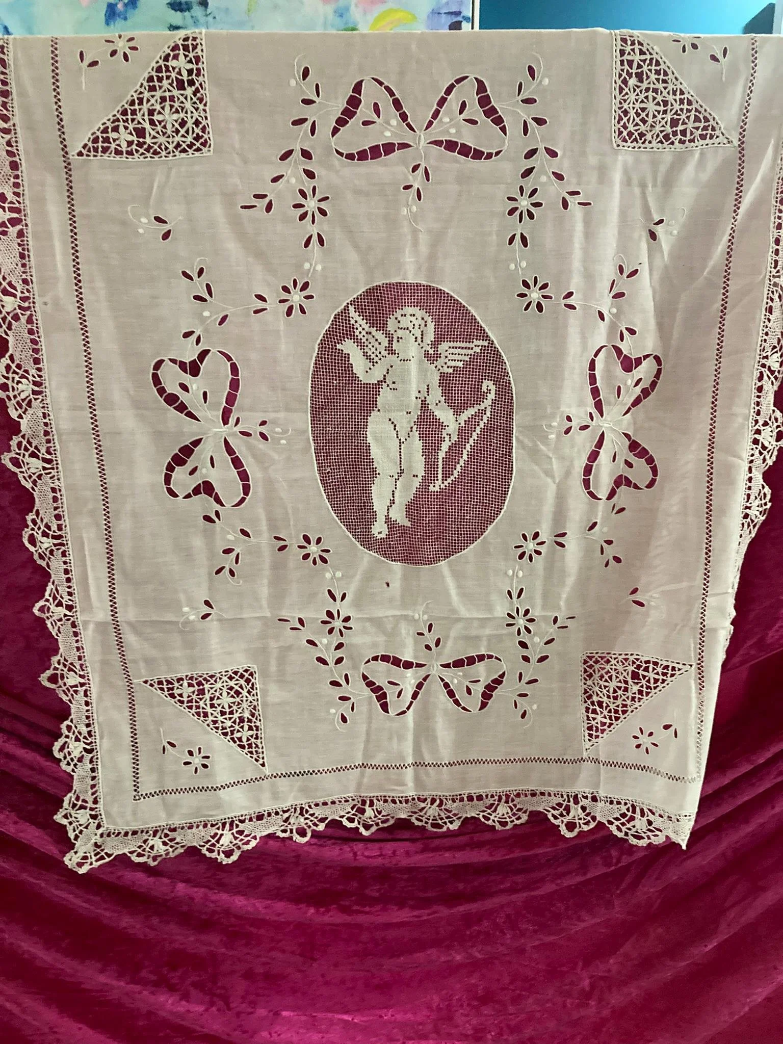 Add a touch of timeless elegance to your home with this beautiful vintage white cutwork and lace textile, featuring a stunning cherub (Cupid) motif at its center. Whether used as a tablecloth, grand runner, wall hanging, or layered accent piece, this heirloom-quality linen brings classic charm and romantic detail to any space.