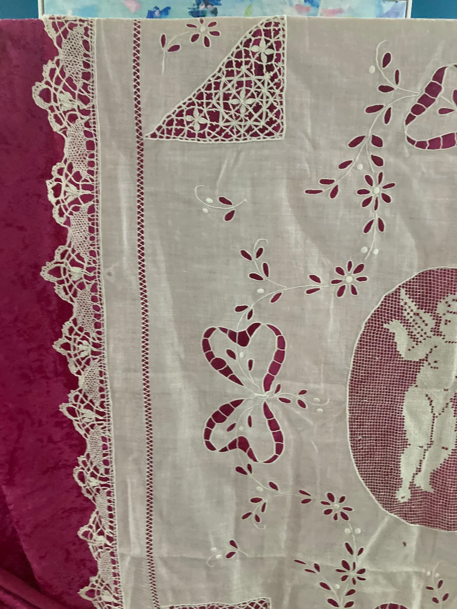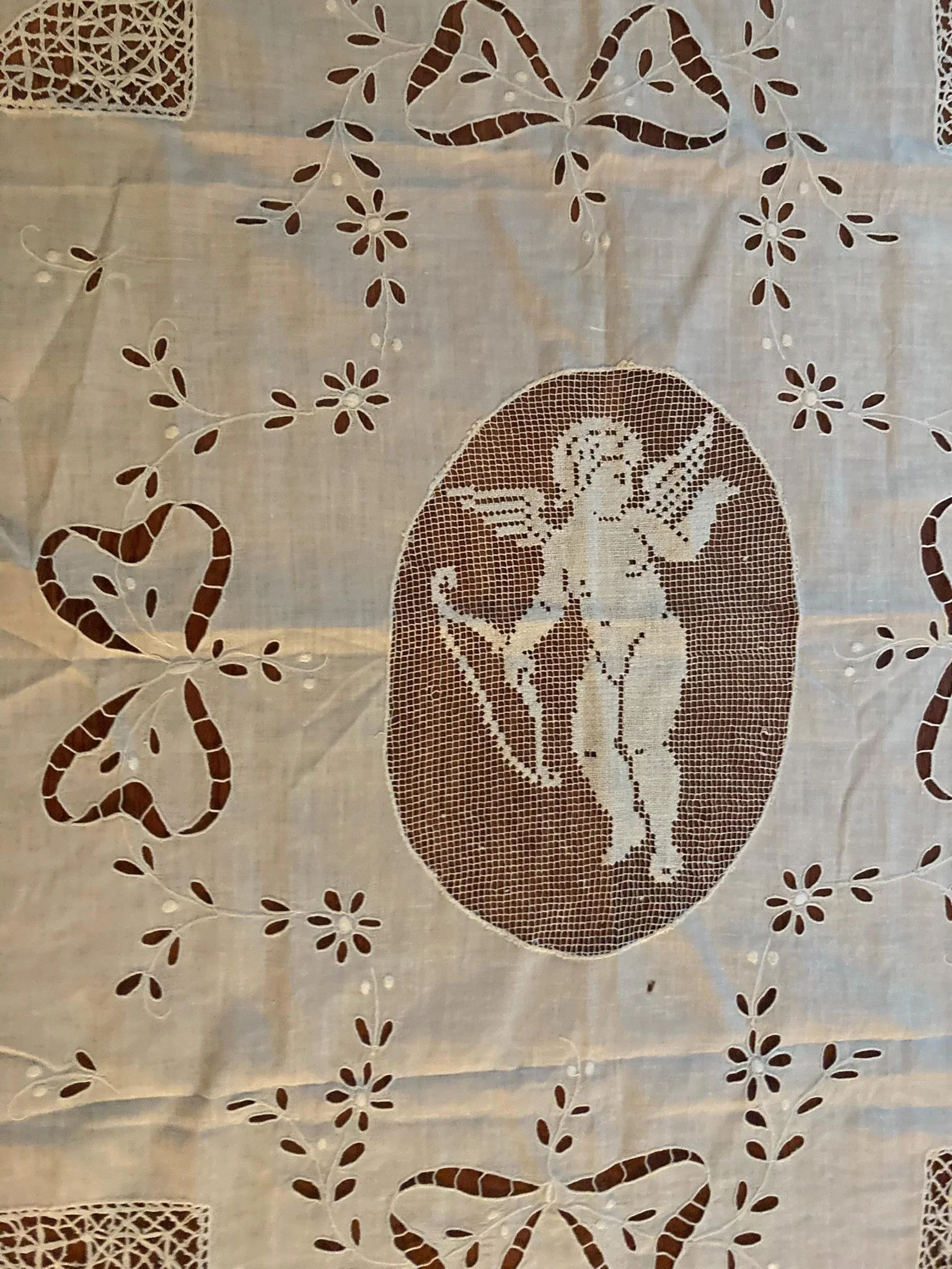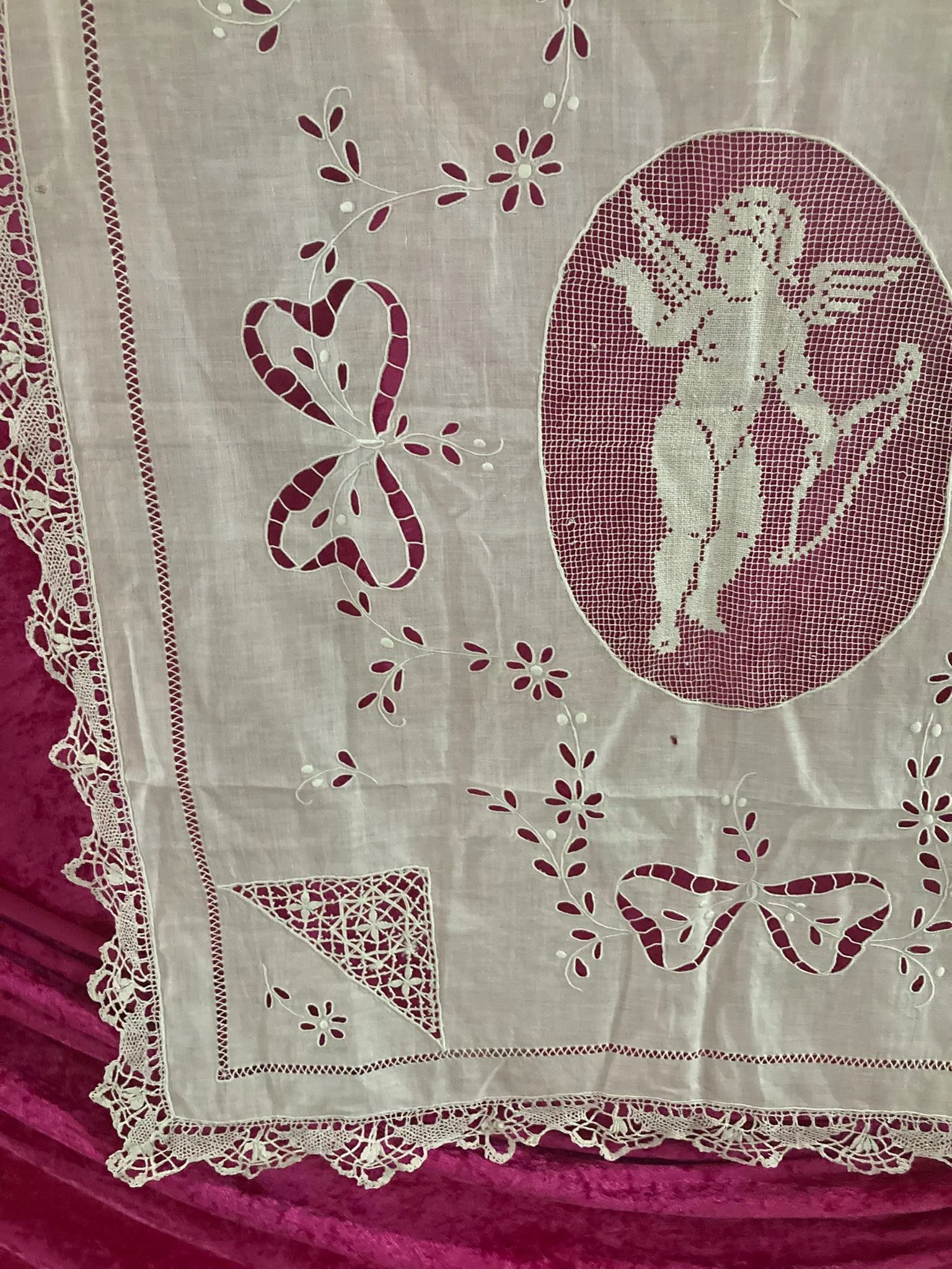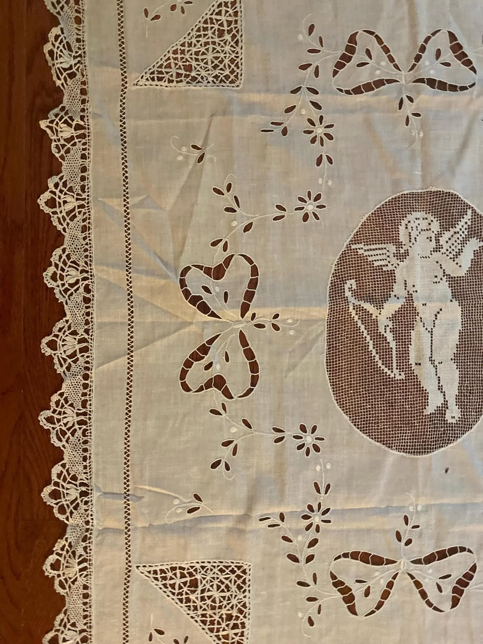 Add a touch of timeless elegance to your home with this beautiful vintage white cutwork and lace textile, featuring a stunning cherub (Cupid) motif at its center. Whether used as a tablecloth, grand runner, wall hanging, or layered accent piece, this heirloom-quality linen brings classic charm and romantic detail to any space.