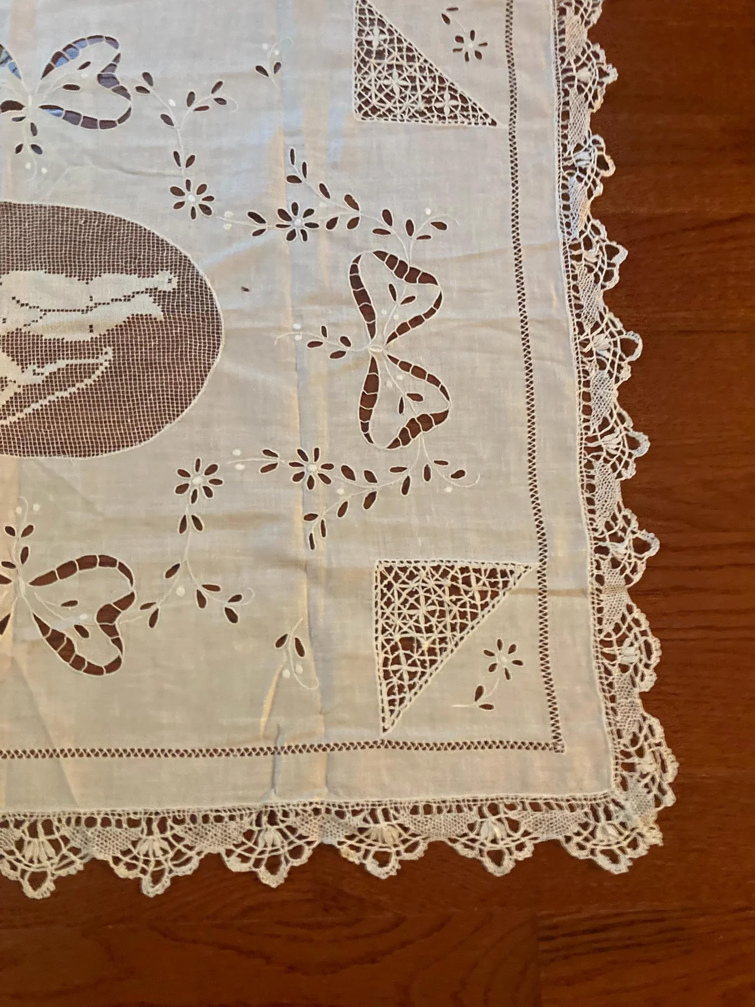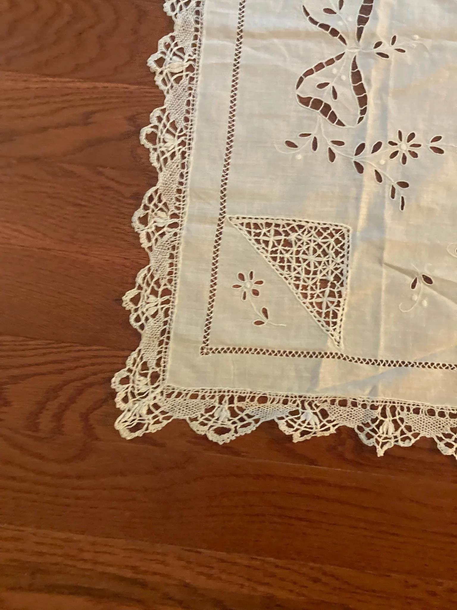 Corner lace insets with intricate triangular patterns, possibly hand-crocheted